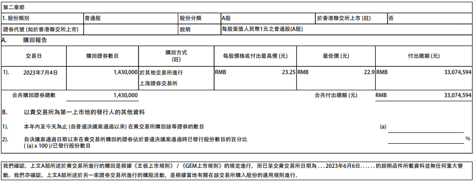 7月4日在港交所公告,公司7月4日耗资3307.46万元购回143万股公司股份,每股回购价格为22.9元-23.25元。