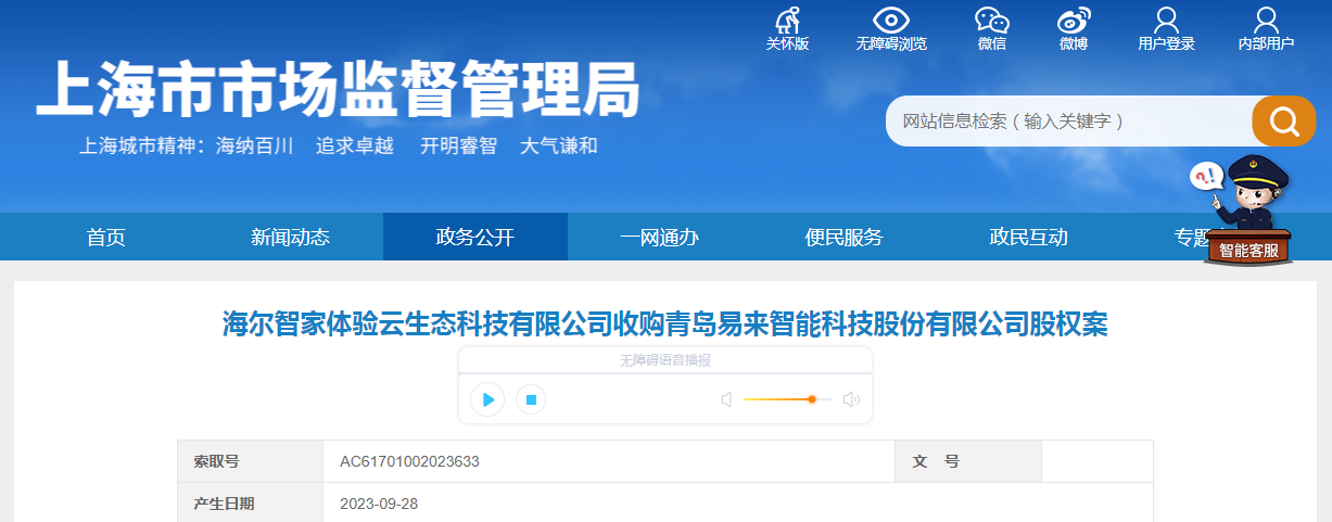 海尔智家体验云生态科技有限公司收购青岛易来智能科技股份有限公司股权案