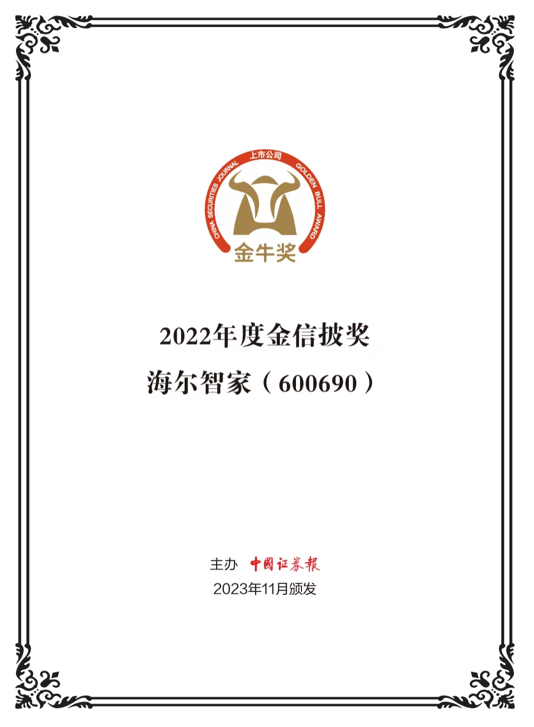 11月23日,由中国证券报、南通市人民政府联合主办的2023上市公司高质量发展论坛暨第25届上市公司金牛奖颁奖典礼在江苏南通隆重举行。会上,备受瞩目的上市公司金牛奖榜单正式揭晓。海尔智家凭借在发展规模、盈利能力、绿色发展、综合效益、股东责任、业务创新、协调投资者关系等方面的优异表现,斩获“港股金牛奖”“金信披奖”两项重量级大奖。此外,11月24日在南通举办的第一届国新杯·ESG金牛奖颁奖典礼上,海尔智家荣获“ESG金牛奖百强”奖项。
