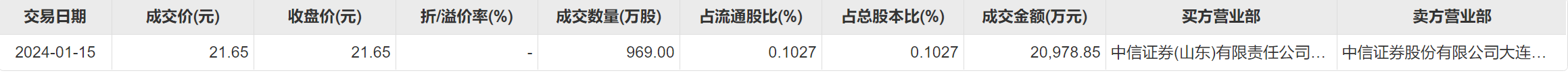 今日大宗交易成交969万股,成交额2.1亿元,占当日总成交额的38.58%,成交价21.65元,较市场收盘价持平。