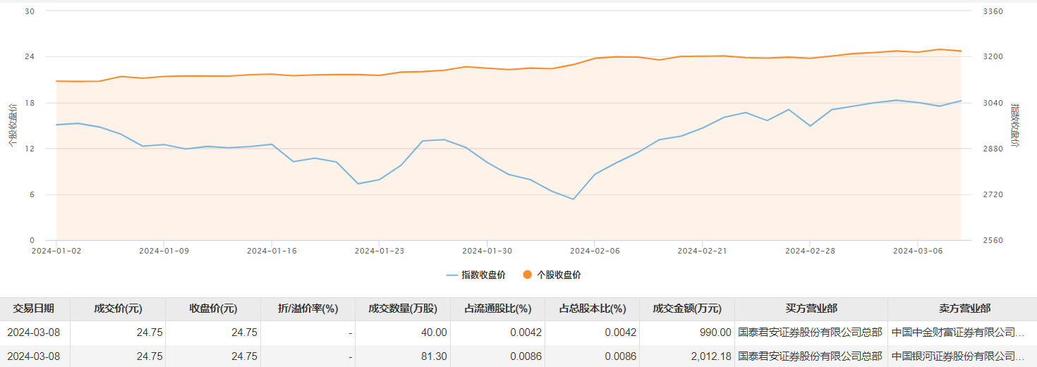 3月8日大宗交易成交121.3万股,成交额3002.18万元,占当日总成交额的4.68%,成交价24.75元,较市场收盘价24.75元持平。