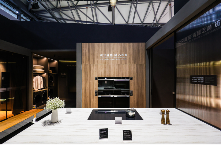 高端大气的卡萨帝展区非常亮眼。一套月辉银配色、微米浮雕工艺的星云套系,吸引不少人打卡。拥有超大容量的星云冰箱,搭载行业首创的双底置循环风幕科技以及零嵌技术,不仅容量够大,还做到两侧无缝、正面与橱柜平齐,“隐身”于橱柜。此外,现场带来“隐形”空调新品,推出五恒空气解决方案,该系统主要以铺设在天花板和地板的顶地冷暖辐射系统来调温,没有空调出风口和内机,从外观上实现“隐形”;同时,系统用水代替冷媒,没有冷硬风感,解决出风噪音问题,听觉上实现“隐形”。