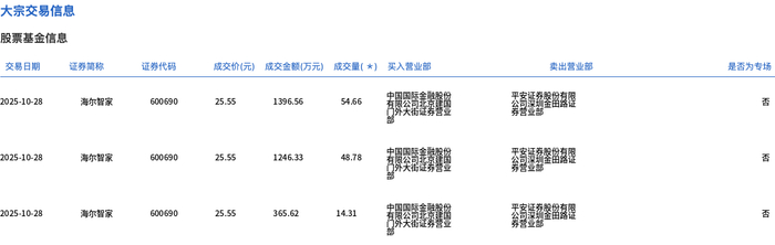 海尔智家今日大宗交易平价成交117.75万股,成交额3008.51万元