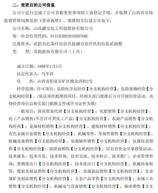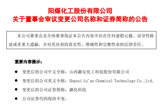 近日,山西上市公司阳煤化工股份有限公司(以下简称“阳煤化工”)发布关于完成公司名称变更暨完成工商登记的公告。这意味着属于“阳煤化工”的时代正式落幕!