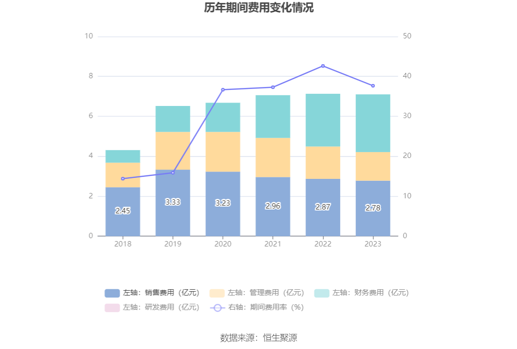 2023年,公司期间费用为7.10亿元,较上年同期减少199.28万元;期间费用率为37.66%,较上年同期下降4.96个百分点。其中,销售费用同比下降3.17%,管理费用同比下降11.65%,财务费用同比增长9.85%。