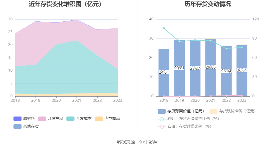 从存货变动来看,截至2023年年末,公司存货账面价值为26.61亿元,占净资产的76.3%,较上年末增加5783.86万元。其中,存货跌价准备为2673.47万元,计提比例为0.99%。