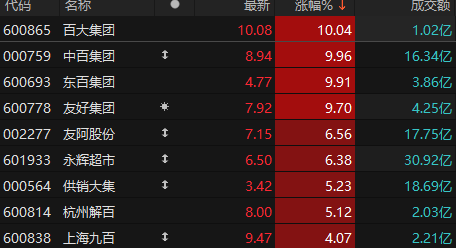 上证报中国证券网讯 12月25日午后,零售板块探底回升,截至13时37分,百大集团、东百集团午后双双涨停,中百集团此前上演“地天板”,友好集团涨超9%,永辉超市、武商集团等跟涨。