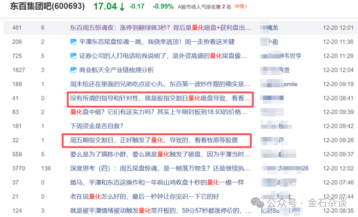 所以,最后结论就是,平潭发展尾盘暴跌12%,东百集团尾盘炸板翻绿,有极大可能是股指交割日量化砸盘所致,而且这几只高位股,从不乏量化身影。还有就是这类股近期涨幅过大,严重偏离基本面,随着游资逐渐退场,散户踩踏也增加了个股风险。而关于市场传闻的私募经理被打带走,金石认为一眼假。