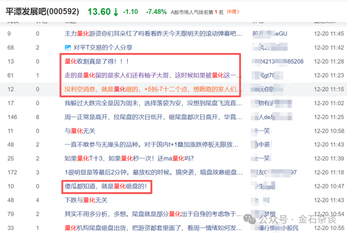 难道平潭发展的暴跌竟然是散户自发驱动,或者说是在急剧抛售之下,散户上演的相互踩踏行情?对此,不少股民纷纷剑指量化,认为是量化的收割或者说是股民的踩踏行情触发了量化。不过,也有股民认为:和量化无关。