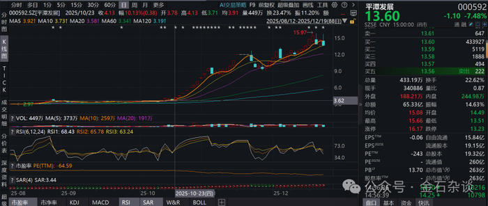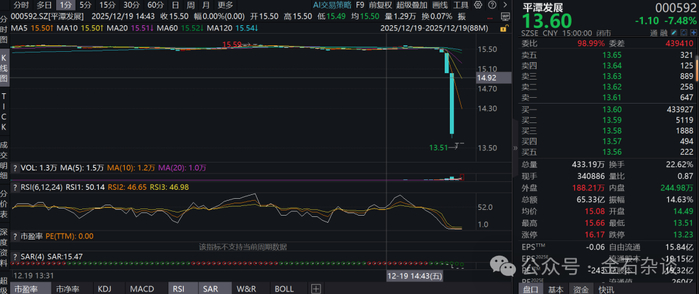 根据昨日盘面,平潭发展尾盘突然遭批量大单抛售,股价5分钟闪崩12%,从涨5%瞬间暴跌7%,最新市值263亿元。