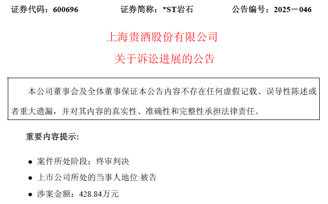10月9日晚间,*ST岩石(上海贵酒,600696.SH)公告称,公司收到江苏省高级人民法院终审判决,因侵害贵州贵酒集团商标权及不正当竞争行为,被判承担经济损失及合理维权费用共计418.85万元,并需在官网及上交所网站发布致歉公告以消除影响。