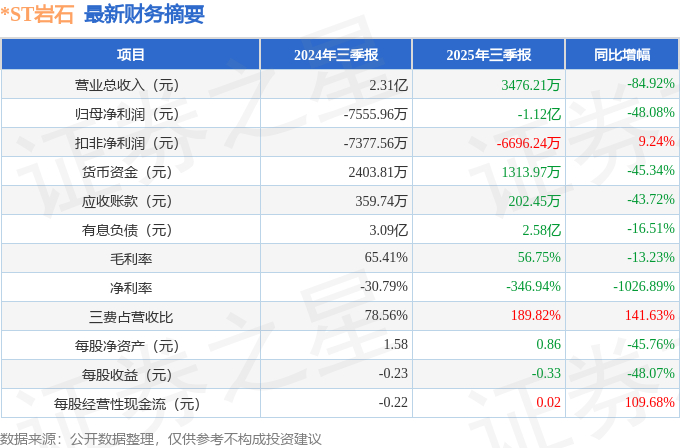 *ST岩石(600696)2025年三季报简析:净利润同比下降48.08%,三费占比上升明显