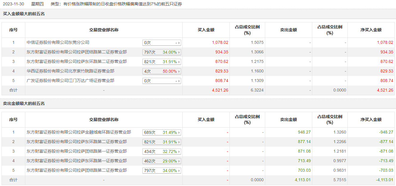 湖南天雁11月30日跌9.71%,全天换手率达13.52%,振幅达11.91%。龙虎榜数据显示,营业部席位合计净买入408.25万元。其中,东方财富证券拉萨金融城南环路证券营业部、东方财富证券拉萨东环路第二证券营业部分别卖出948.27万元、877.14万元;中信证券东莞分公司、东方财富证券拉萨团结路第二证券营业部分别买入1078.02万元、934.35万元。