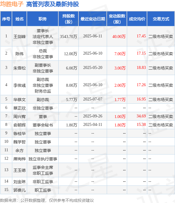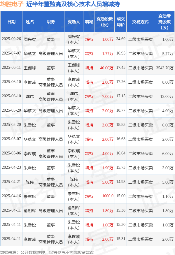均胜电子近半年内的董监高及核心技术人员增减持详情如下: