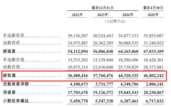 频繁的跨国并购,虽然做大了均胜电子的营收规模,但也带来了沉重的财务负担。招股书显示,公司总负债,从2022年末的364.08亿元升至2025年4月30日的468.02亿元,呈现出逐年走高态势。