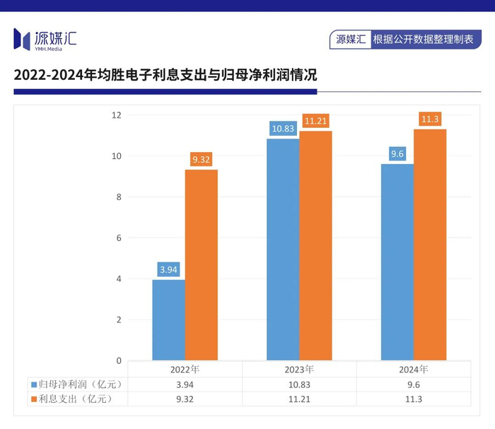 2022年至2024年,均胜电子的利息支出分别为9.32亿元、11.21亿元和11.30亿元,而同期公司归母净利润分别仅为3.94亿元、10.83亿元和9.60亿元,利息支出甚至超过了净利润。
