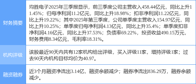 2025年10月31日,东吴证券研究员黄细里,孙仁昊发布了对均胜电子的研报《2025年三季报点评:新订单获取与机器人业务进展顺利,业绩超预期》,该研报对均胜电子给出“买入”评级。证券之星数据中心根据近三年发布的研报数据计算,该研报作者对此股的盈利预测准确度为50.55%。