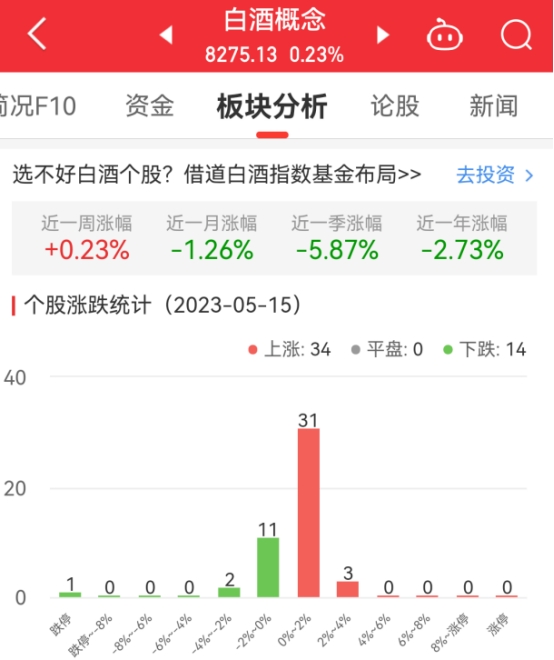 中国经济网北京5月15日讯今日,白酒概念板块整体涨幅0.23%,其中34只股票上涨,0只股票平盘,14只股票下跌。