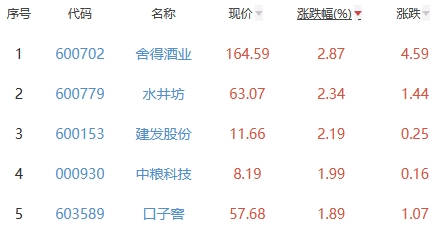 其中,舍得酒业、水井坊、建发股份、中粮科技、口子窖位列板块涨幅前五位,涨幅分别为2.87%、2.34%、2.19%、1.99%、1.89%。