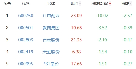 江中药业、武商集团、吉宏股份、天虹股份、*ST皇台位列涨幅榜后五位,涨幅分别为-10.02%、-3.52%、-2.16%、-1.54%、-1.51%。