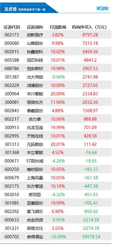 机构净买入前三的股票分别是创新医疗、山推股份、协鑫能科,净买入金额分别是8797万元、7215万元、6459万元。