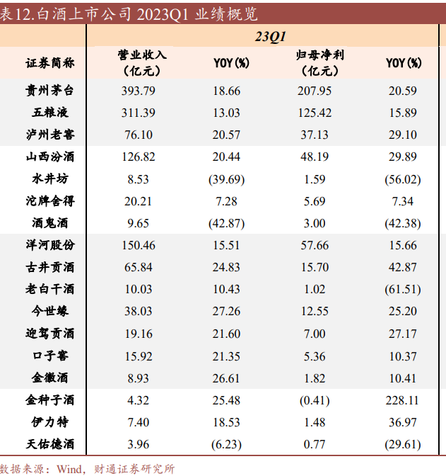 但次高端就有些“分裂了”。体量大的山西汾酒优势明显,2023年1季度营收126.8亿元,同比增速20.44%、归属净利润48.19亿元,同比增速29.89%;