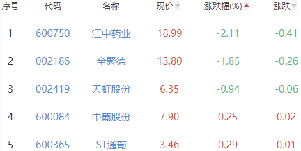 江中药业、全聚德、天虹股份、中葡股份和ST通葡位列涨幅榜后五位,涨幅分别为-2.11%、-1.85%、-0.94%、0.25%和0.29%。