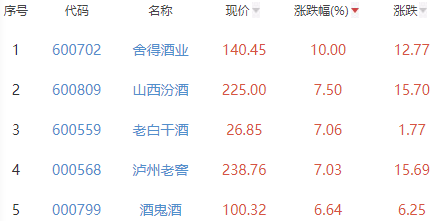 其中,舍得酒业、山西汾酒、老白干酒、泸州老窖和酒鬼酒位列板块涨幅前五位,涨幅分别为10.00%、7.50%、7.06%、7.03%和6.64%。