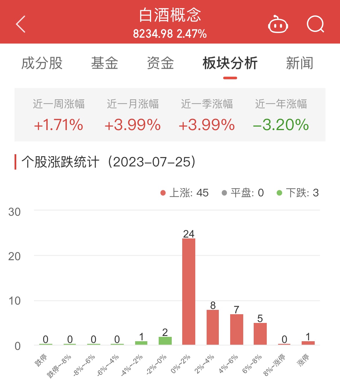 中国经济网北京7月25日讯今日,白酒概念板块整体涨幅2.47%,其中45只股票上涨,0只股票平盘,3只股票下跌。