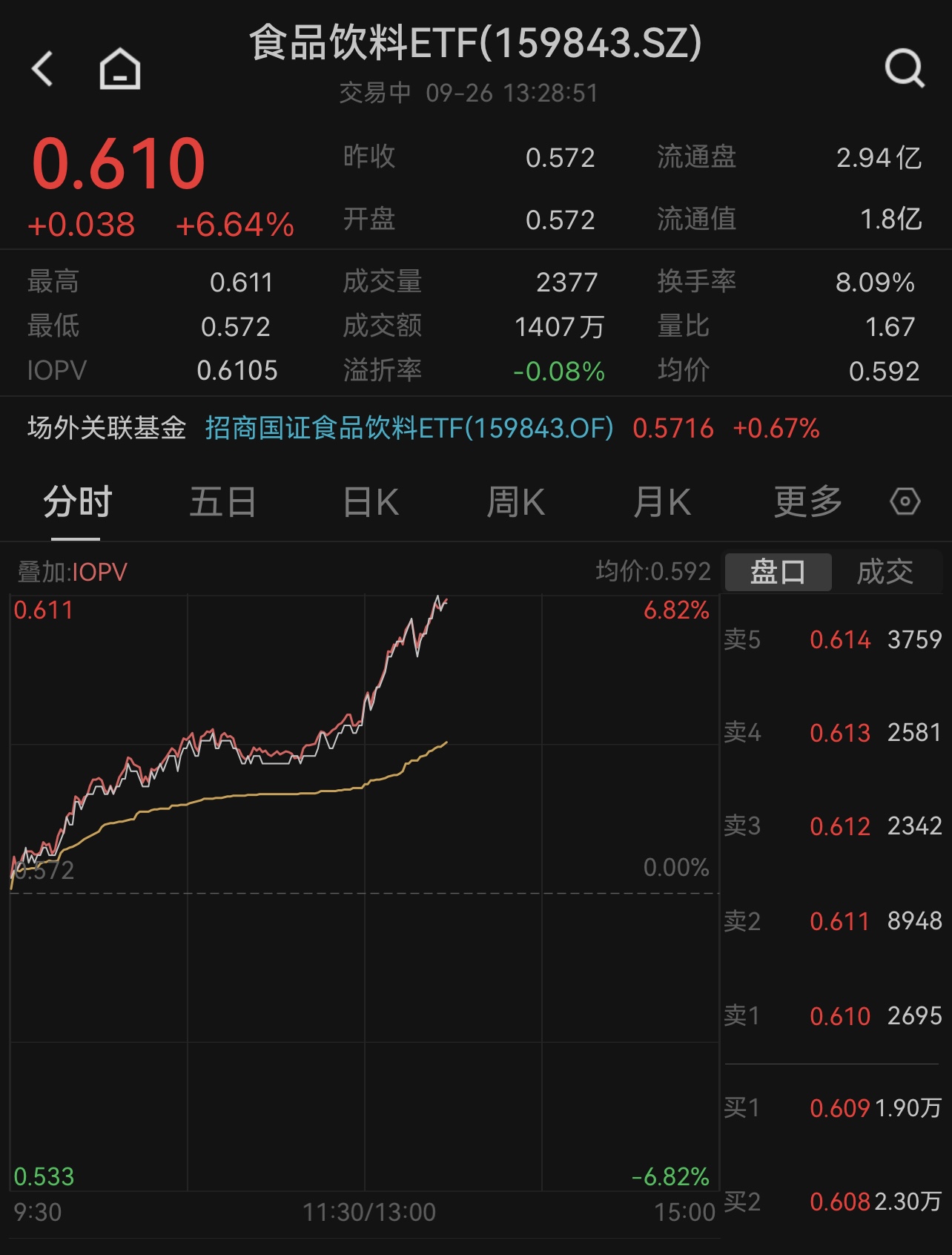 白酒股掀涨停潮,泸州老窖、山西汾酒、舍得酒业多股齐封涨停,食品饮料ETF(159843)午后涨幅扩大至6.64%!
