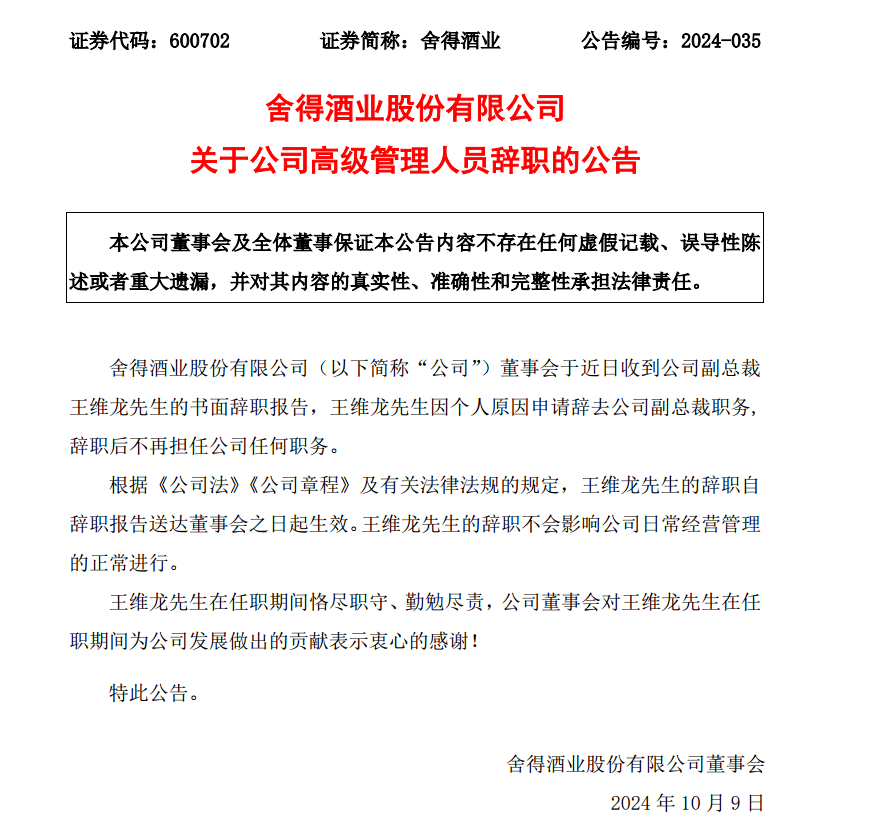 10月9日,舍得酒业(600702)公告,公司董事会于近日收到公司副总裁王维龙的书面辞职报告,王维龙因个人原因申请辞去公司副总裁职务,辞职后不再担任公司任何职务。根据规定,王维龙的辞职自辞职报告送达董事会之日起生效。