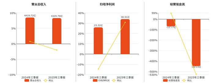 公司营业总收入为4329.79亿元。归母净利润为30.51亿元,较去年同报告期归母净利润增加7.20亿元,同比较去年同期上涨30.87%。经营活动现金净流入为-80.11亿元。