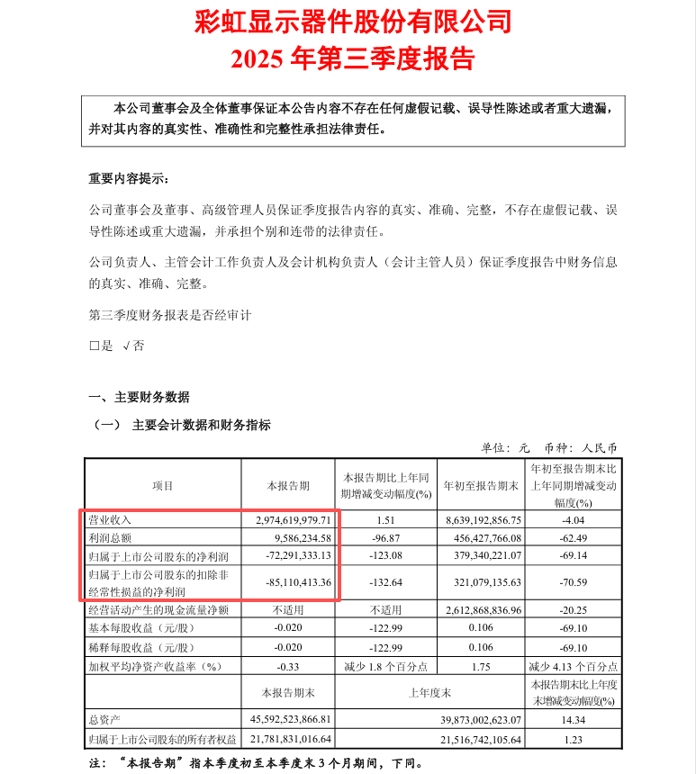 10月30日晚间,,彩虹显示器件股份有限公司(证券代码:600707,简称 “彩虹股份”)发布 2025 年第三季度报告。报告显示,公司三季度营收实现微增,但受面板价格下滑、费用增加等因素影响,盈利指标同比大幅承压,单季度净利润由盈转亏,年初至报告期末净利润亦显著下降。