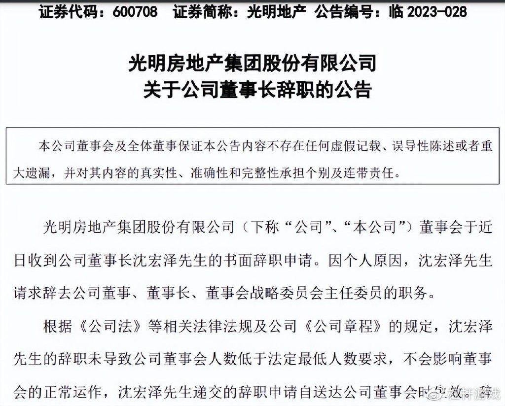 即将于2023年6月5日召开的光明房地产集团股份有限公司(下文简称“光明地产”)2022年度业绩说明会,将不会再看到董事长沈宏泽先生出席。