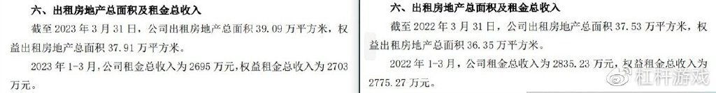 注意出租房屋的数据,光明地产公告没有披露同比增减幅度。杠杆游戏去查阅了一下2022年同期的公告,情况是这样的: