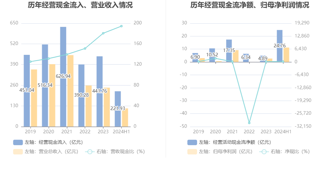 2024年上半年,公司营业收入现金比为194.43%,净现比为221.57%。