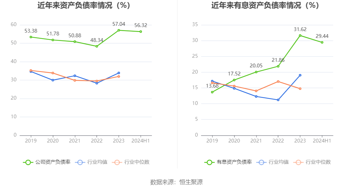在偿债能力方面,公司2024年上半年末资产负债率为56.32%,相比上年末下降0.72个百分点;有息资产负债率为29.44%,相比上年末下降2.18个百分点。