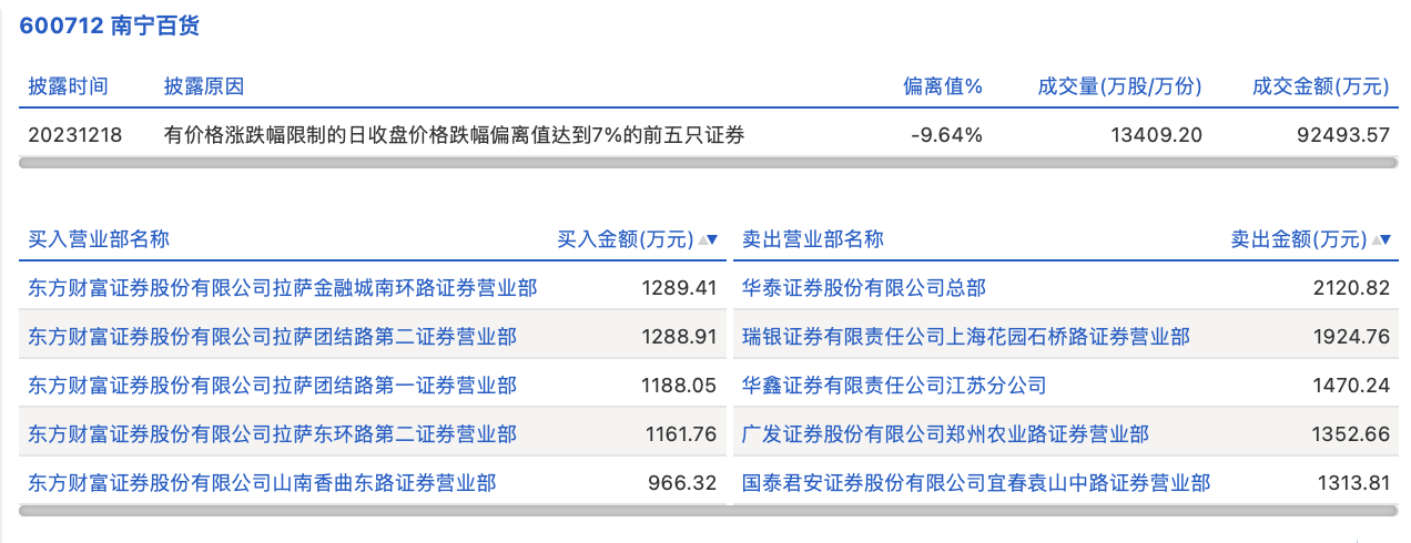 12月18日,南宁百货今日跌停,全天换手率达24.89%,振幅达14.64%。龙虎榜数据显示,营业部席位合计净卖出2287.84万元。其中,华泰证券总部、瑞银证券上海花园石桥路证券营业部分别卖出2120.82万元、1924.76万元;东方财富证券拉萨金融城南环路证券营业部、东方财富证券拉萨团结路第二证券营业部分别买入1289.41万元、1288.91万元。