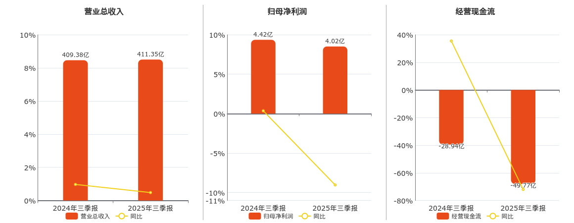公司营业总收入为411.35亿元,在已披露的同业公司中排名第5,较去年同报告期营业总收入增加1.97亿元,实现5年连续上涨,同比较去年同期上涨0.48%。归母净利润为4.02亿元,在已披露的同业公司中排名第11,较去年同报告期归母净利润减少3991.12万元,同比较去年同期下降9.03%。经营活动现金净流入为-49.77亿元,在已披露的同业公司中排名第32,较去年同报告期经营活动现金净流入减少20.83亿元。