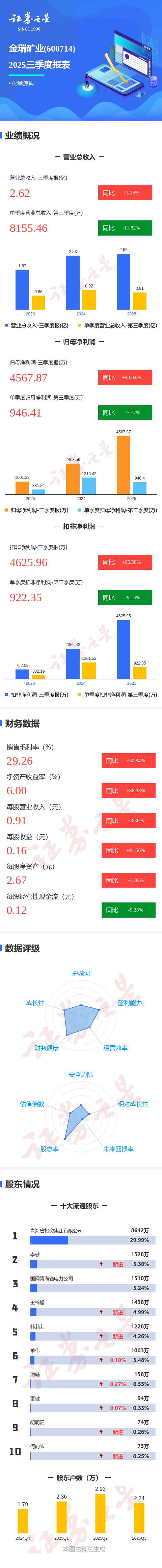 图解金瑞矿业三季报:第三季度单季净利润同比下降27.78%