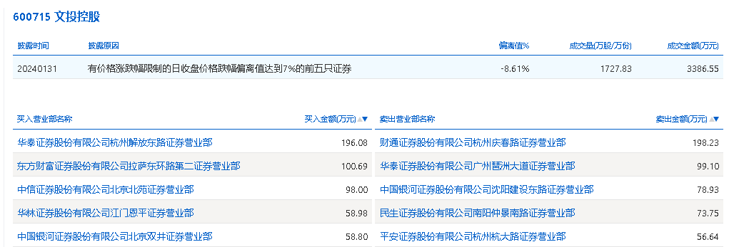 1月31日,文投控股今日跌停,全天换手率达0.93%,振幅达0%。龙虎榜数据显示,营业部席位合计净买入5.88万元。其中,财通证券杭州庆春路证券营业部、华泰证券广州琶洲大道证券营业部分别卖出198.23万元、99.10万元;华泰证券杭州解放东路证券营业部、东方财富证券拉萨东环路第二证券营业部分别买入196.08万元、100.69万元。
