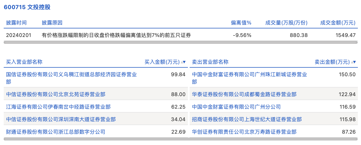 2月1日,文投控股今日跌停,全天换手率达0.47%,振幅达0%。龙虎榜数据显示,营业部席位合计净卖出286.45万元。其中,中国中金财富证券有限公司广州珠江新城证券营业部、华泰证券成都蜀金路证券营业部分别卖出150.50万元、122.94万元;国信证券义乌稠江街道总部经济园证券营业部、中信证券北京北苑证券营业部分别买入99.84万元、88.00万元。