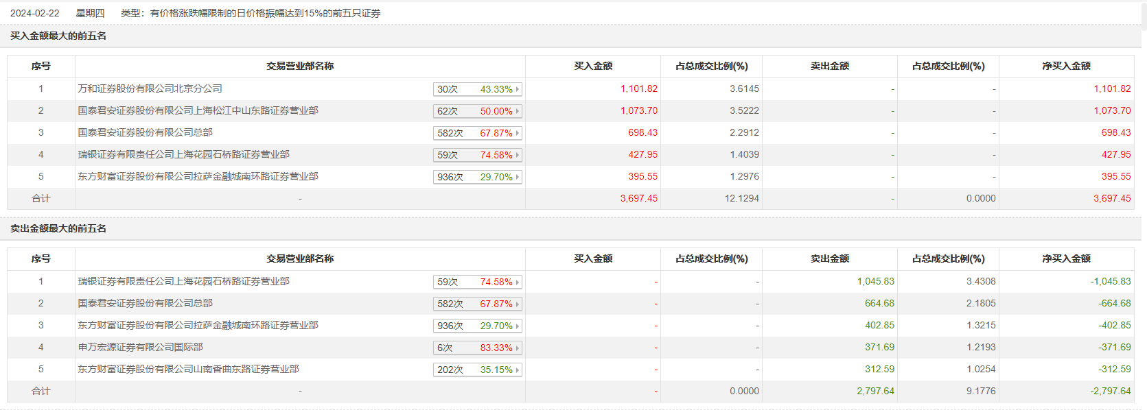 具体来看,万和证券北京分公司、国泰君安证券上海松江中山东路证券营业部分别买入1101.82万元、1073.70万元;瑞银证券上海花园石桥路证券营业部、国泰君安证券总部分别卖出1045.83万元、664.68万元。