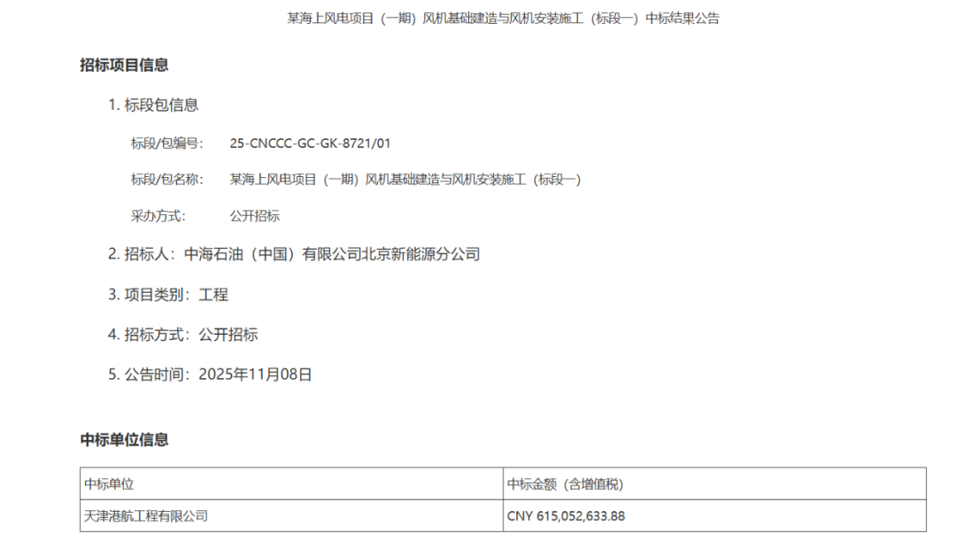 11月8日,中国海洋石油集团有限公司采办业务管理与交易系统发布《某海上风电项目(一期)风机基础建造与风机安装施工(标段一)中标结果公告》。