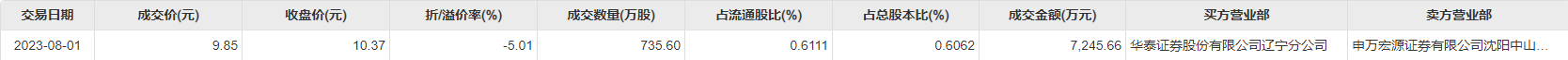 8月1日大宗交易成交735.6万股,成交额7245.66万元,占当日总成交额的36.38%,成交价9.85元,较市场收盘价10.37元折价5.01%。