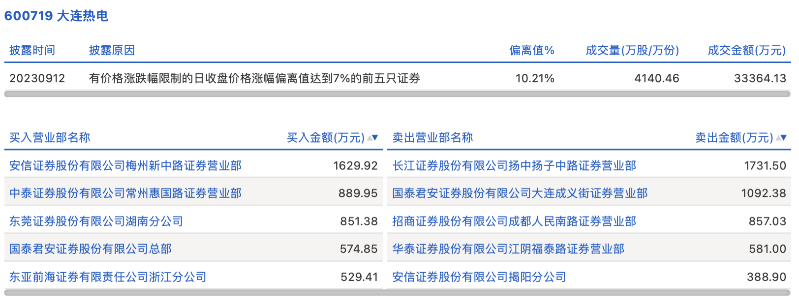 9月12日,大连热电今日涨停,龙虎榜数据显示,上榜营业部席位全天成交9126.33万元,占当日总成交金额比例为27.35%。其中,买入金额为4475.52万元,卖出金额为4650.81万元,合计净卖出175.29万元。
