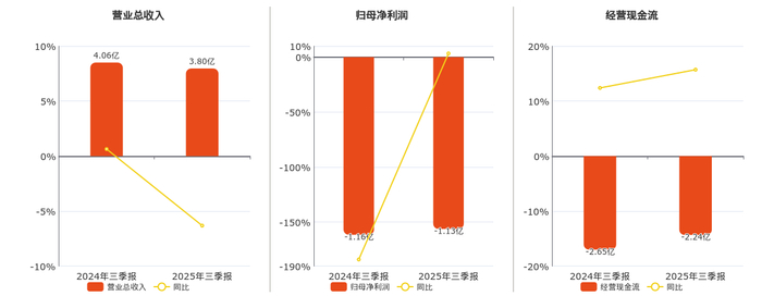 公司营业总收入为3.80亿元。归母净利润为-1.13亿元,较去年同报告期归母净利润增加381.46万元。经营活动现金净流入为-2.24亿元,较去年同报告期经营活动现金净流入增加4165.37万元,实现2年连续上涨。