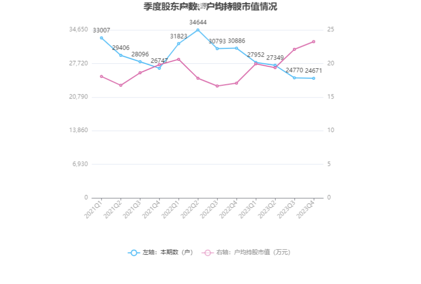 筹码集中度方面,截至2023年年末,公司股东总户数为2.47万户,较三季度末下降了99户,降幅0.40%;户均持股市值由三季度末的22.11万元上升至23.26万元,增幅为5.20%。
