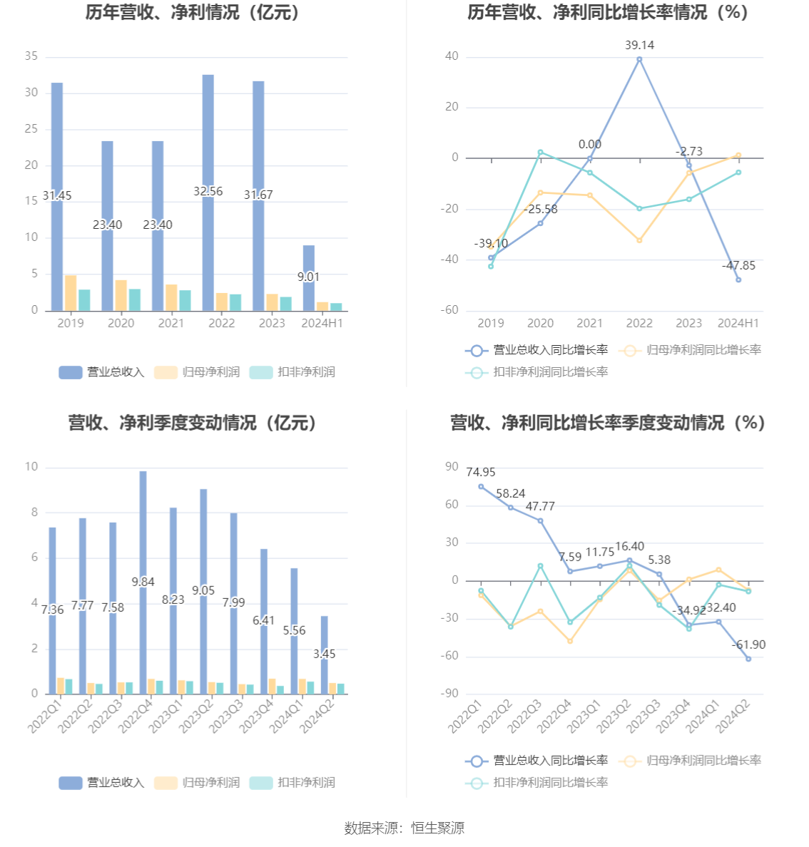 根据半年报,公司第二季度实现营业总收入3.45亿元,同比下降61.90%,环比下降38.00%;归母净利润5038.45万元,同比下降7.31%,环比下降25.53%;扣非净利润4700.8万元,同比下降8.28%,环比下降16.60%。