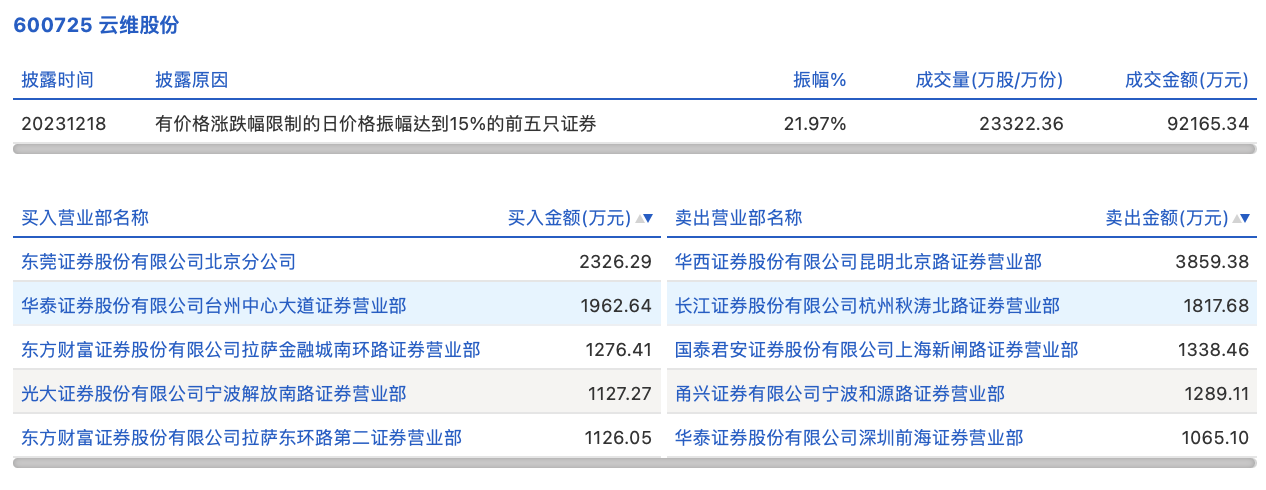 12月18日,云维股份今日涨2.54%,龙虎榜数据显示,上榜营业部席位全天成交1.72亿元,占当日总成交金额比例为18.65%。其中,买入金额为7818.66万元,卖出金额为9369.73万元,合计净卖出1551.07万元。